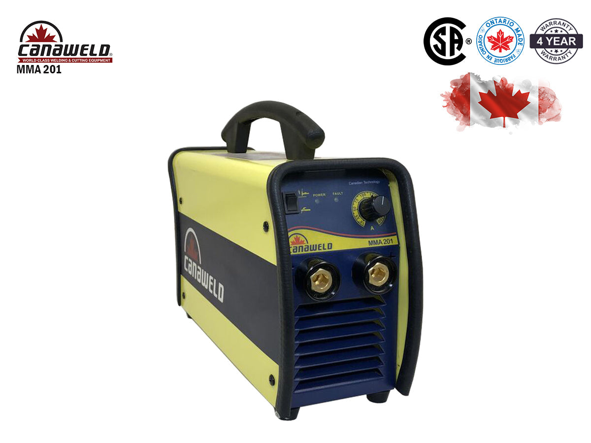 The MMA 201 is a portable, powerful and versatile Ontario Made welding machine. This unit is capable of either Stick Welding or TIG welding with a lift start, and it’s the best in its class for its duty cycle. The MMA 201 is not only powerful but it’s also designed to be lightweight. Maximum current is 200A, and can deliver 160A with a 100% duty cycle. These Combined features make it the perfect machine for a welder on the go, who needs some extra power and the ability to weld all day long.