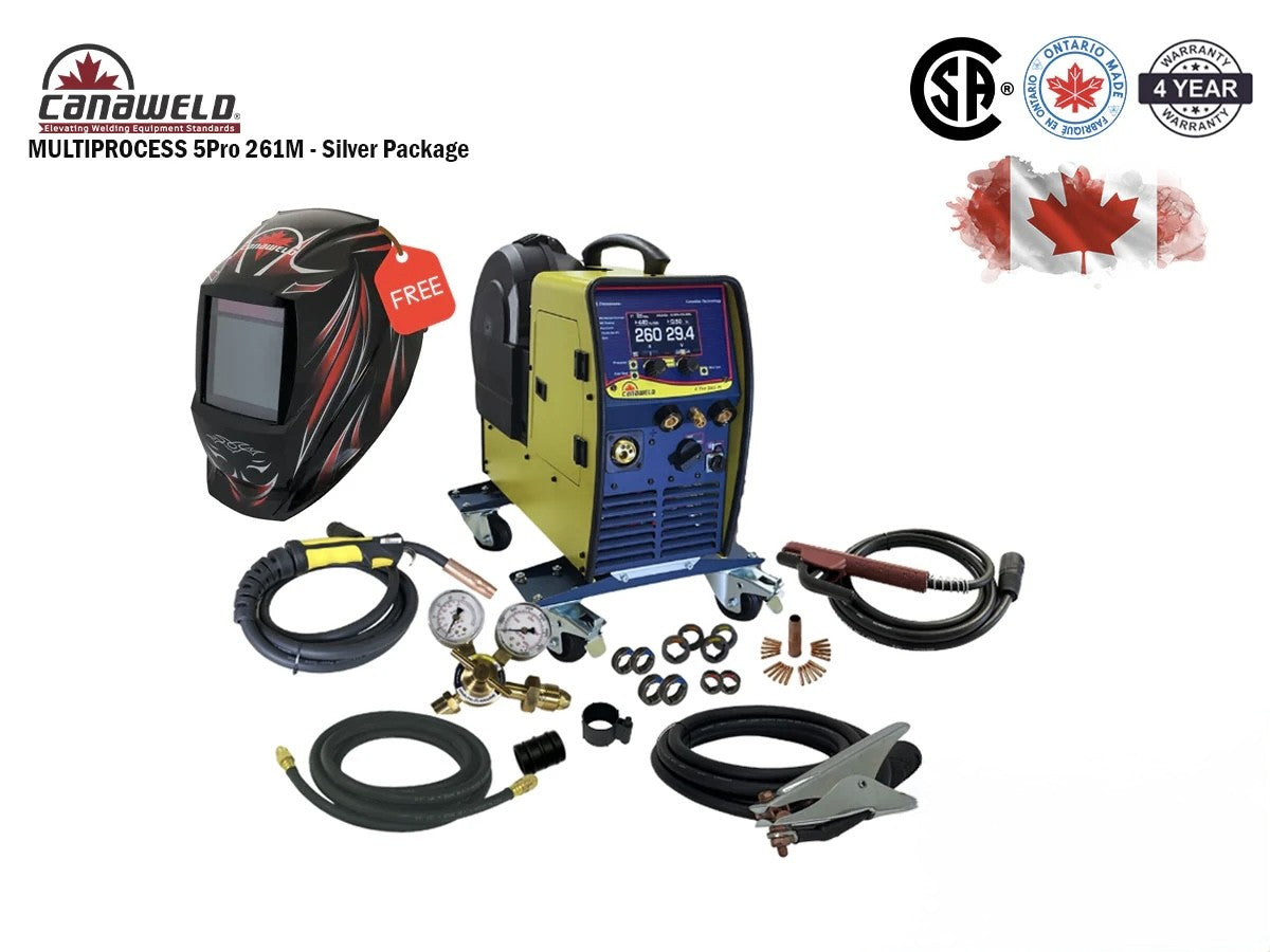 The Canaweld Multiprocess 5 PRO 261M is a high-performance, heavy-duty multiprocess welding machine, designed for precision, power, and durability in industrial welding applications. This Canadian-made welding machine supports MIG (Manual & Synergic), MIG Brazing, Flux-Cored, TIG DC (No HF), and Stick welding, making it one of the most versatile and reliable welding solutions on the market. With one of the highest duty cycles in its class in North America, it delivers 260A at 60% duty cycle and 230A at 100% duty cycle (at 104°F/40°C). Engineered for heavy-duty industrial performance, this Canaweld welding machine provides exceptional arc stability while remaining portable and easy to move, making it ideal for welding workshops, job sites, and field operations. Canaweld offers North America’s only 4-year warranty, ensuring unmatched reliability and superior performance. The heavy-duty 4-roll wire feeder provides smooth, consistent wire feeding, enhancing welding efficiency and precision. Built to handle all metals, including aluminum, stainless steel, and alloys, the Canaweld Multiprocess 5 PRO 261M sets a new industry standard in welding innovation, efficiency, and durability. This industrial multiprocess welder is the ultimate choice for professional welders seeking high-quality, Canadian-made welding equipment.