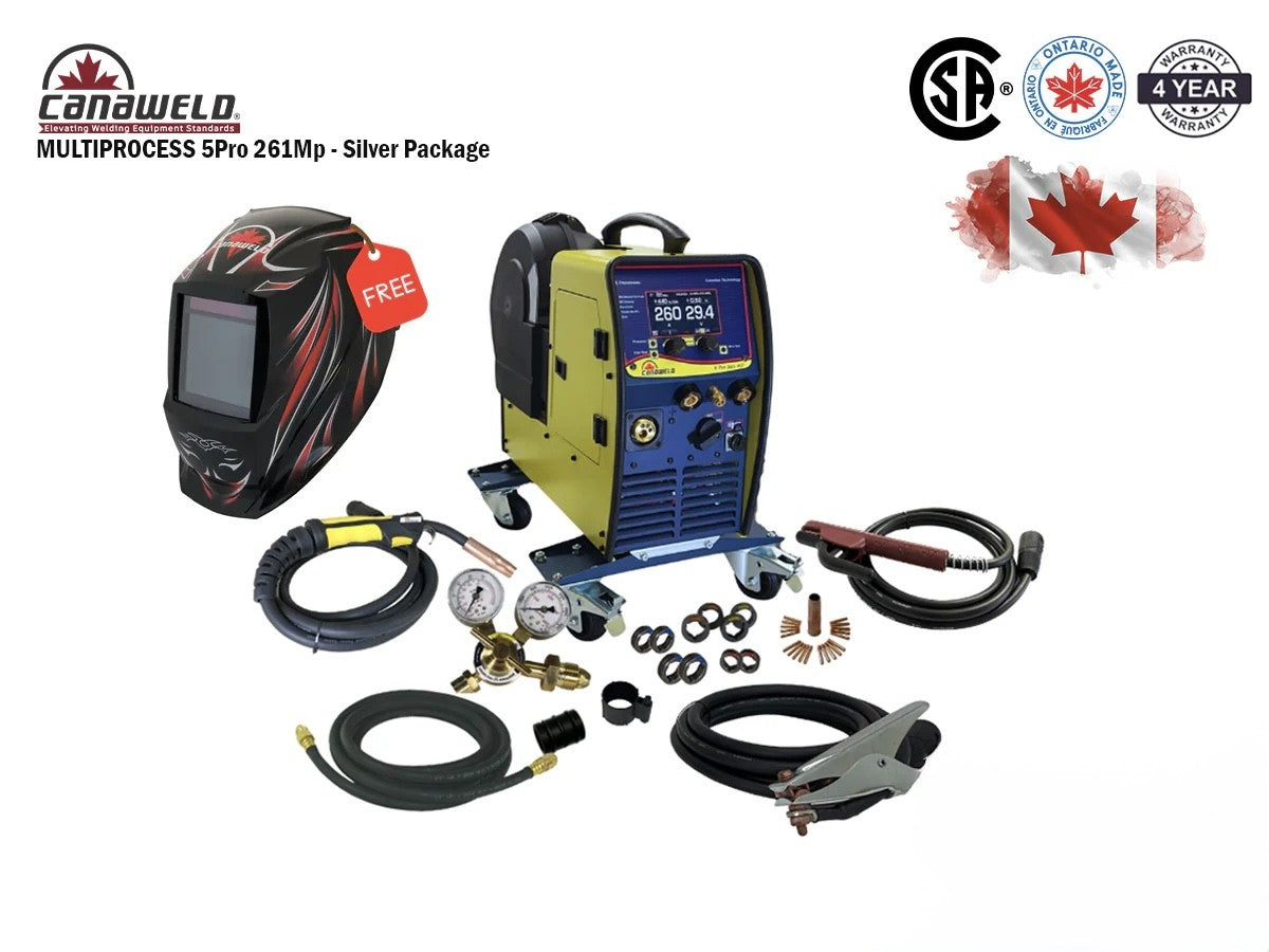 The Canaweld Multiprocess 5 PRO 261MP is a high-performance, heavy-duty multiprocess welding machine, designed for precision, power, and durability in industrial welding applications. This Canadian-made welding machine supports MIG Pulse (Manual & Synergic), MIG Brazing, Flux-Cored, TIG DC (No HF), and Stick welding, making it one of the most versatile and reliable welding solutions on the market. With one of the highest duty cycles in its class in North America, it delivers 260A at 60% duty cycle and 230A at 100% duty cycle (at 104°F/40°C). Engineered for heavy-duty industrial performance, this Canaweld welding machine provides exceptional arc stability while remaining portable and easy to move, making it ideal for welding workshops, job sites, and field operations. Canaweld offers North America’s only 4-year warranty, ensuring unmatched reliability and superior performance. The heavy-duty 4-roll wire feeder provides smooth, consistent wire feeding, enhancing welding efficiency and precision. Built to handle all metals, including aluminum, stainless steel, and alloys, the Canaweld Multiprocess 5 PRO 261MP sets a new industry standard in welding innovation, efficiency, and durability. This industrial multiprocess welder is the ultimate choice for professional welders seeking high-quality, Canadian-made welding equipment.